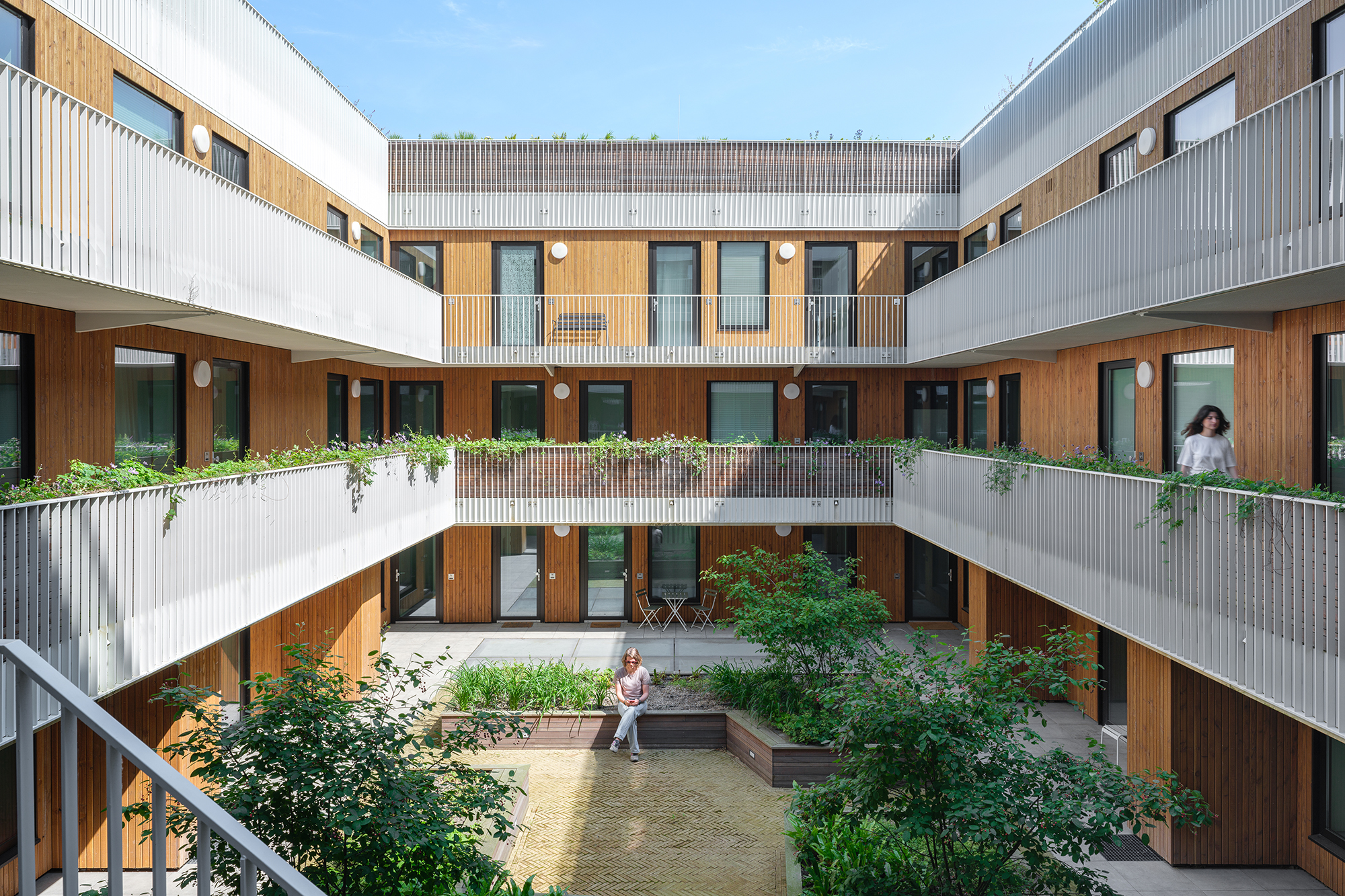 The inner garden is designed as a quiet, communal space, where layered galleries, natural light, and soft materials create a silent dialogue between privacy, nature, and community.