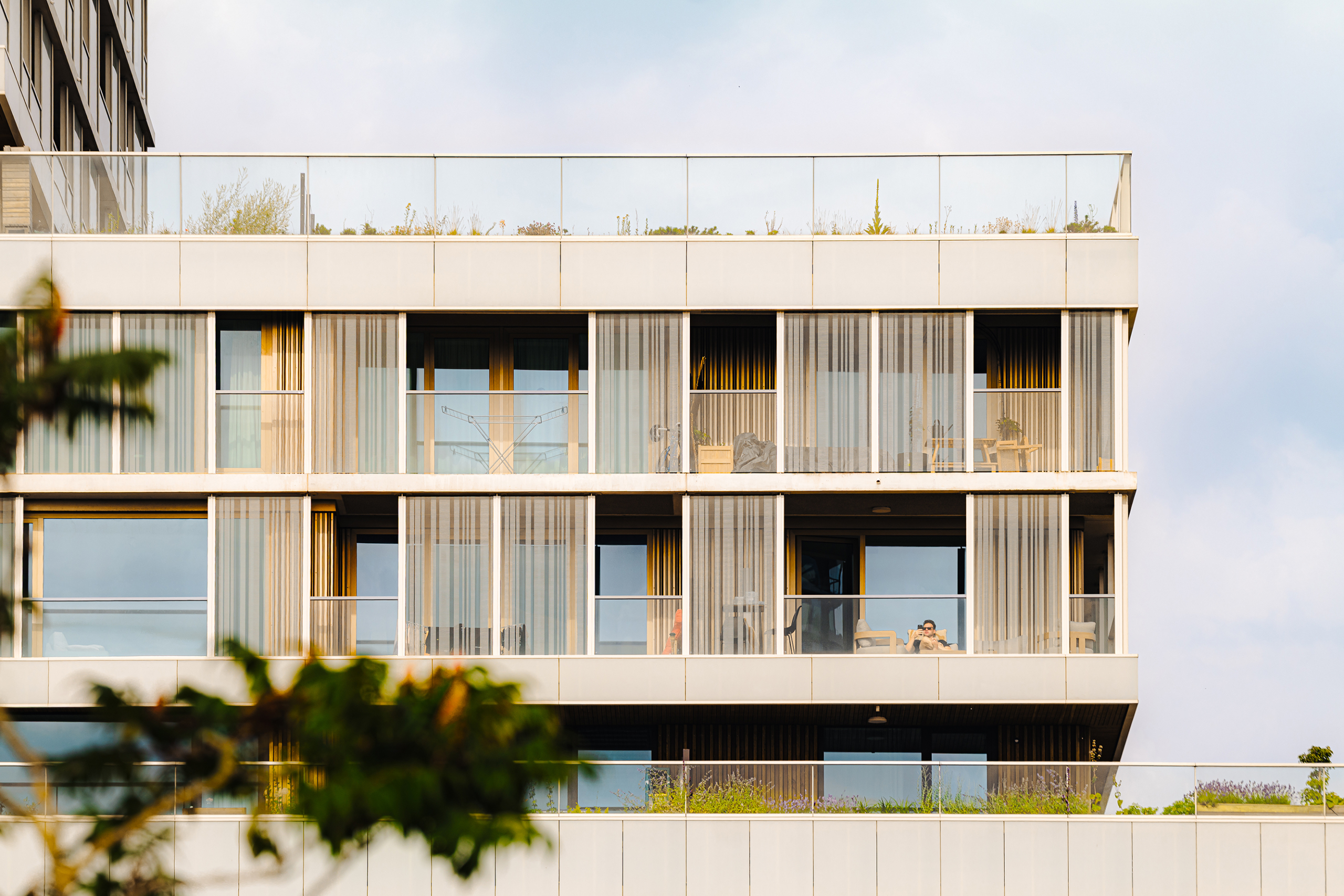 In Floating Gardens, social dynamics and civic value are essential factors for a more sustainable future for residents, children, and other users. The building façade also plays a role in enabling sustainable living, learning, and wellbeing. The southern horizontal bands are made of unique white solar panels. Vertical glass panels provide acoustic insulation and wind protection, while wooden cladding and planter boxes create a green living environment and a soft visual appeal. The façade integrates nature-inclusive features, renewable energy generation, and aesthetic quality down to the smallest detail.
