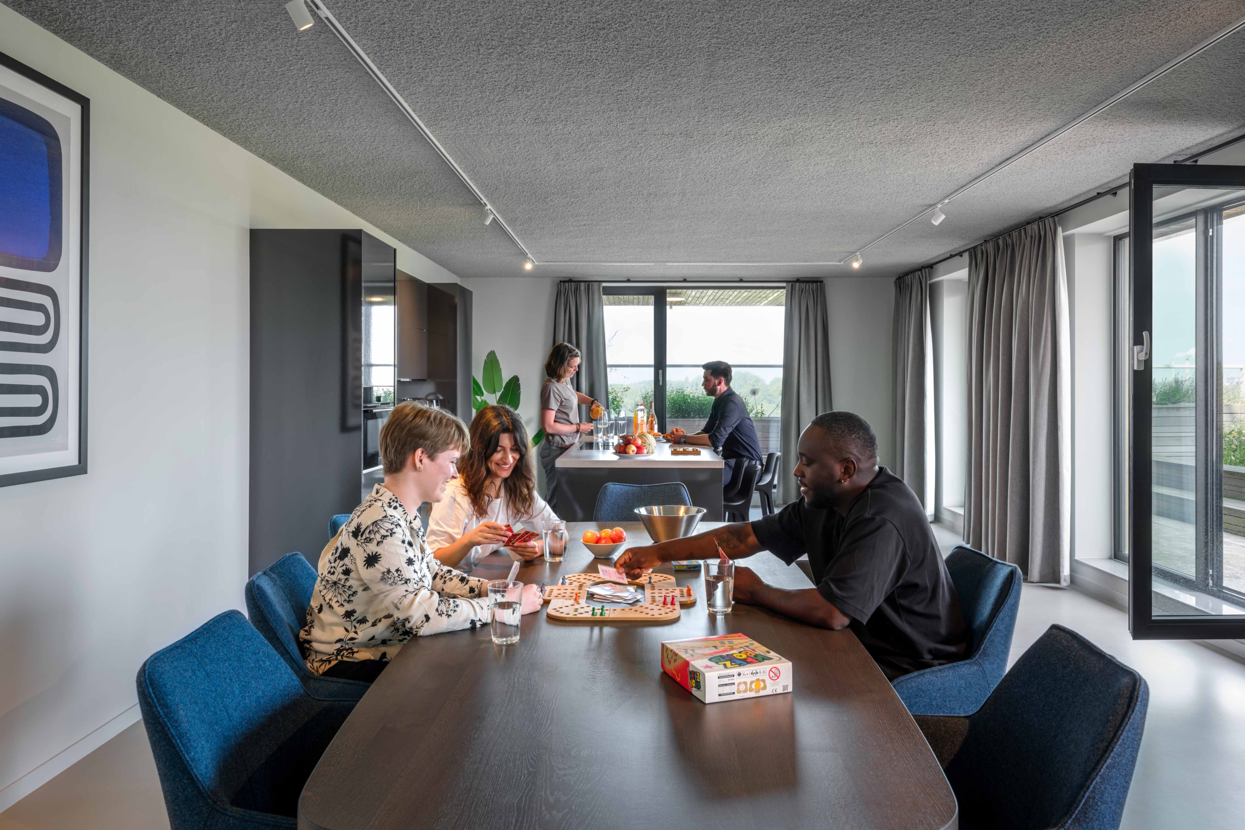 Social sustainability is a key theme in Floating Gardens. The sharing economy is also introduced here. At the heart of the building, adjacent to a green patio, is the communal living room, spanning three floors. It functions as an informal meeting space for residents – where they can read the newspaper, work on laptops, have lunch, drinks, or dinner with neighbors and friends. This space fosters a strong sense of community, expanding residents’ mental living space beyond their own apartments.