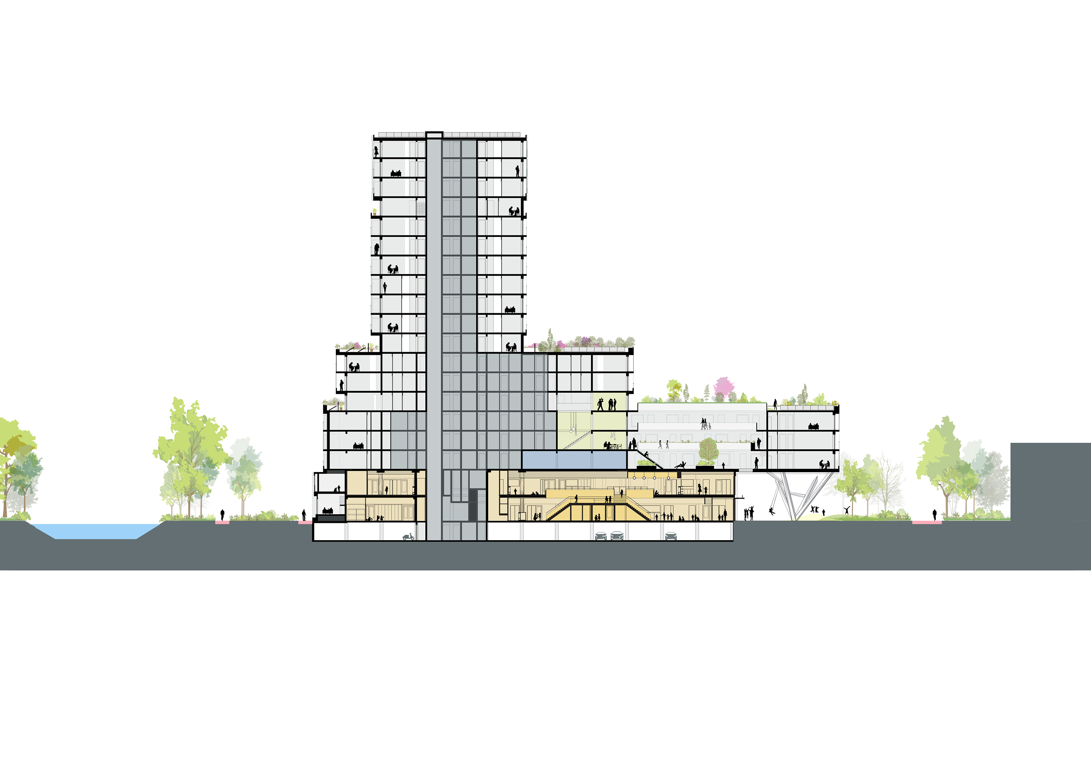 Floating Gardens is sustainably designed: all residences are equipped with heat pumps and a significant part of the building’s energy is self-generated. By integrating (white) solar panels into the façade, more rooftop space is made available for greenery. Floating Gardens not only connects with nature; It connects people. With its ‘all-in-one school’, it is a building for the future.
